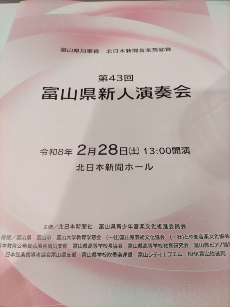 25年前に自分も出演した富山県新人演奏会の審査に携わらせていただきました。プロを目指す若き音楽家の真摯な演奏に胸をうたれました。結果に関係なく、皆様の今後の飛躍に期待します。
